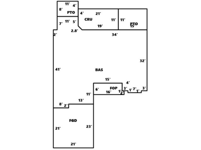 BUILDING DIMENSIONS BAS=N41E2N7E11S5SE@45-2.83E34S32W3S1W7N1W3N4W15S11W13S2W8Area:1757;FGD=N21E8N2E13S23W21Area:467;FOP=E15S4E1S2W16N6Area:9 92;FOG=Area:323;PTO=E11S4S4W11N8Area:88;CRU=S4S5SE@45-2.83E19N11W21Area:229;PTO=E15S11W15N11Area:165;TotalArea:3121