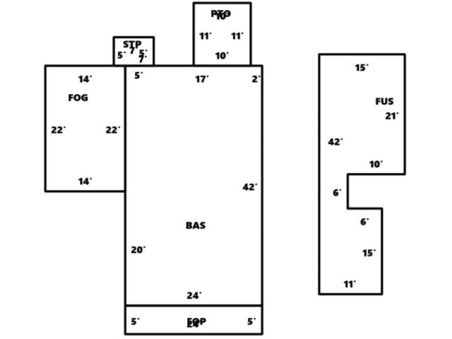 BUILDING DIMENSIONS FOG=N22E14S22W14Area:308;BAS=S22S20E24N42W2W17W5Area:1008;PTO=N11W10S11E10Area:110;STP=N5W7S5E7Area:35;FOP=S5E24N5W24Are ea:120;FUS=N42E15S21W10S6E6S15W11Area:510;TotalArea:2091