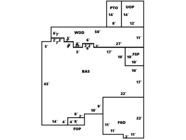 BUILDING DIMENSIONS BAS=W10N10W17N2W6S2W5N3W5N2W7S2W5S45E14N4E9N2E10N9E22N17Area:1861;FSP=N10E10S10W10Area:100;WDD=E27N11W50S6E7S2E5S3E5N2E6 6S2Area:488;FOP=N4E9S4W9Area:36;FGD=S11E11S2E11N22W22S9Area:462;FUS=Area:1250;UOP=N14W12S14E12Area:168;PTO=N14W8S14E8Are ea:112;TotalArea:4477